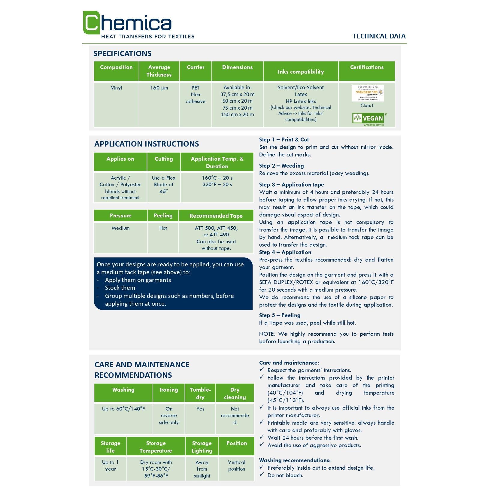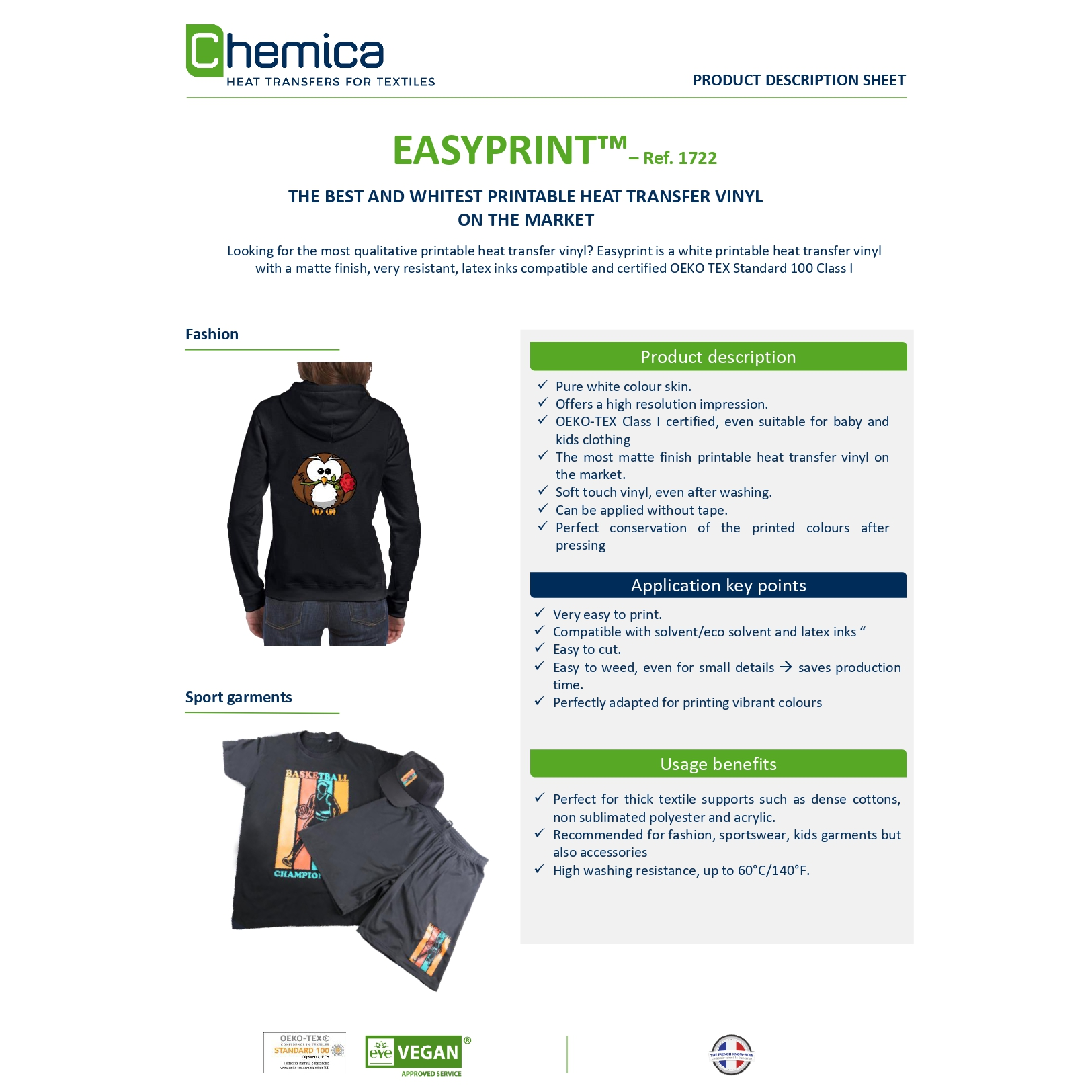 White matte PVC heat transfer material for solvent, eco-solvent, and latex printing, designed for heat transfer onto textile fabrics. It has an OEKO TEX Standard 100 Class certificate.There is no need to use transfer film when doing solid printing work.