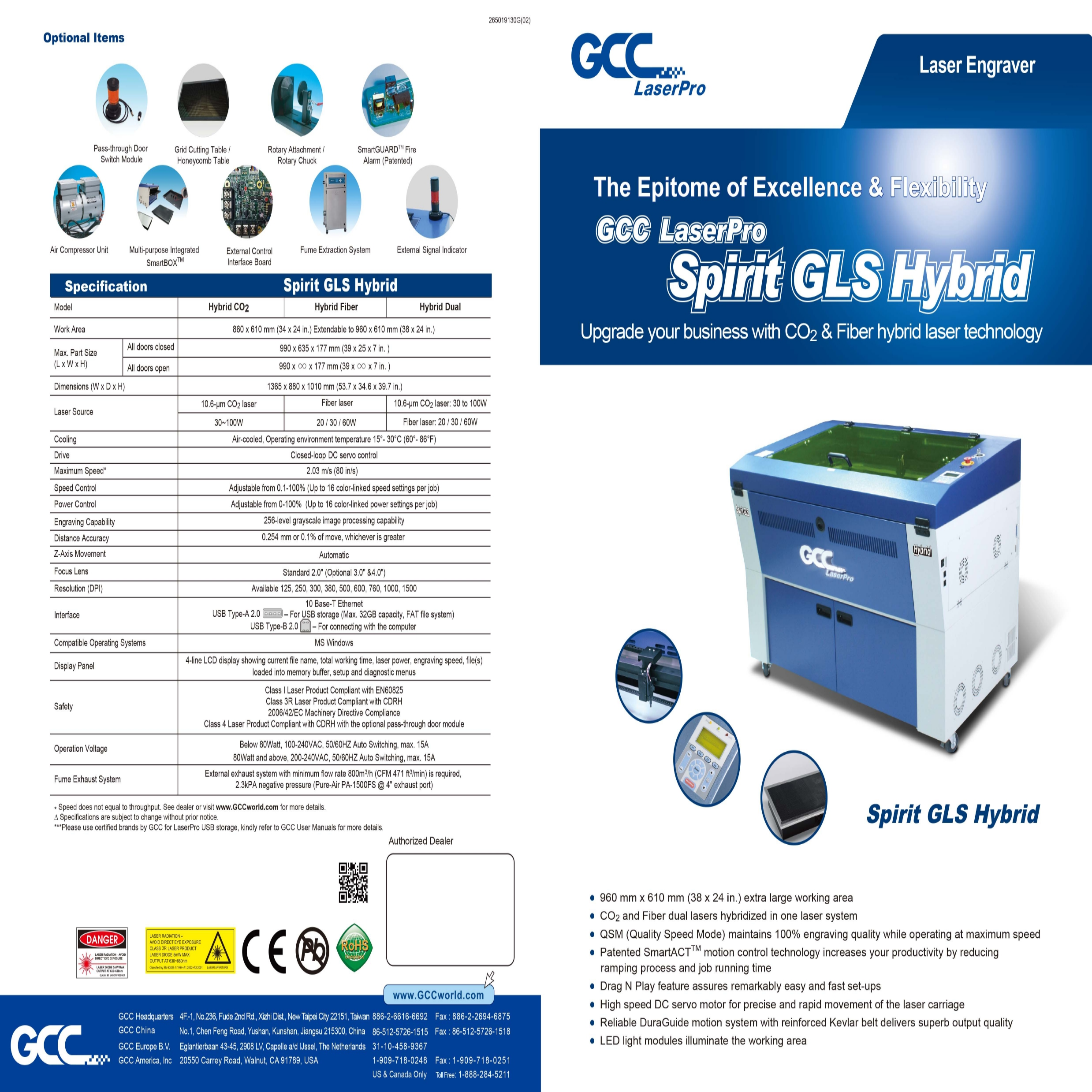 GCC Spirit GLS Hybrid lasers stand out by offering both CO2 and Fiber Hybrid laser options in one system, allowing for engraving, cutting, and marking on both organic and metallic materials The front and rear doors that open allow for processing of large-size materials The illumination inside the laser allows for a clear view of the work process The Spirit GLS Hybrid models no longer have quickly worn wheels, which have been replaced with sturdy metal bearings