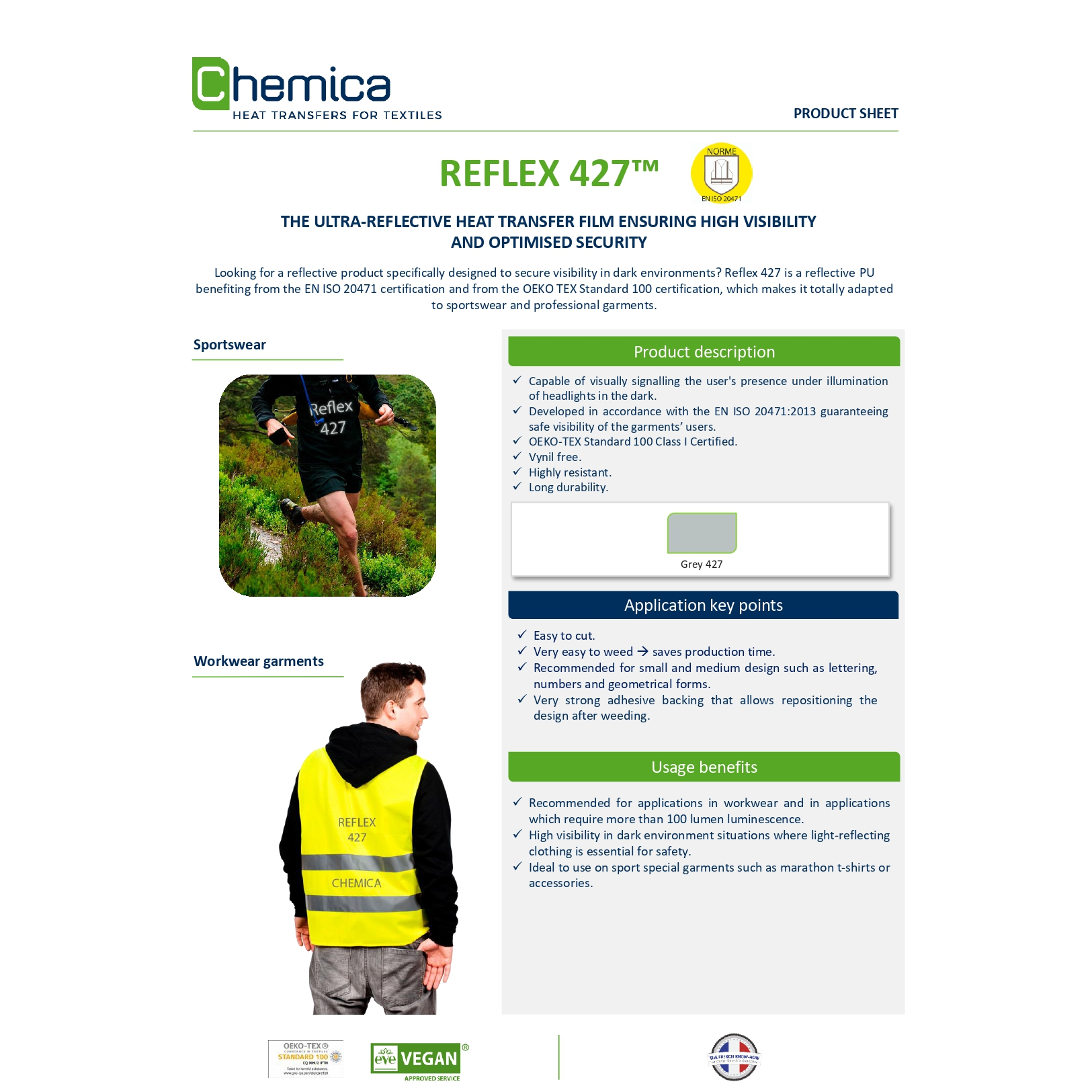 Hotmark 427 – A reflective thermal film ensuring good visibility and optimal safety. Adapted for use in sportswear and professional work clothing, suitable for use with cotton, polyester, acrylic, and other materials.Certified OEKO-TEX Standard 100 and EN ISO 20471.