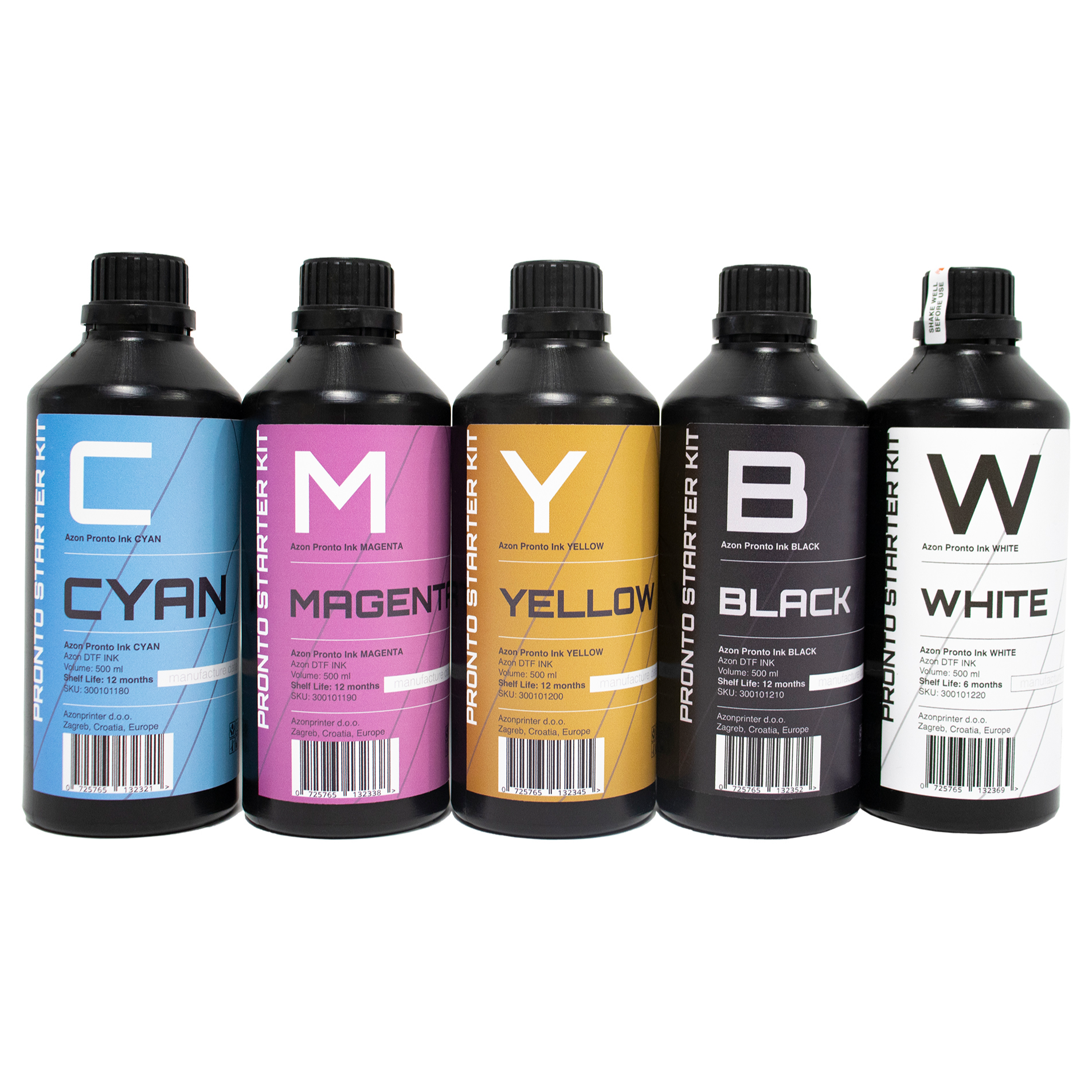 “”Azon Pronto” in Lithuanian translates to “That Quickly” in English” Create dyes in a way that ensures vivid colors and maximum color fastness to washing. The paint is suitable for light and dark fabrics. DTF paints are made according to the highest sanitary standards and have an OEKO-TEX certificate.Tūris: 700 (ml) translates to “Capacity: 700 (ml)”Colors: Cyan, Magenta, Yellow, Black, White.Manufacturer: Azon