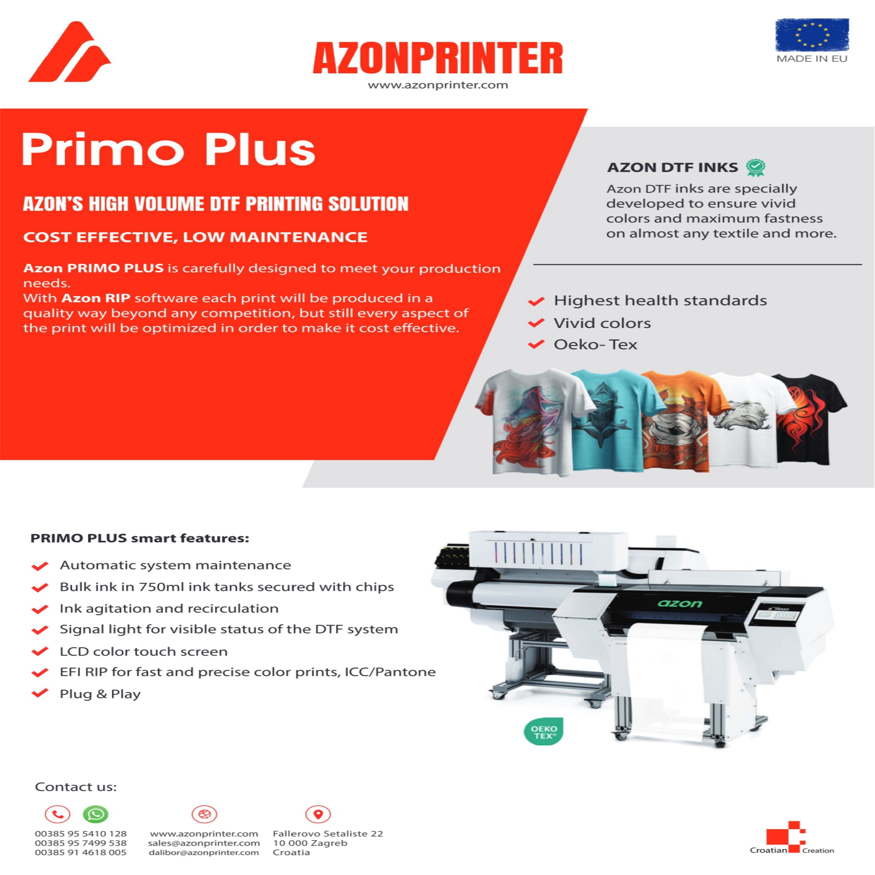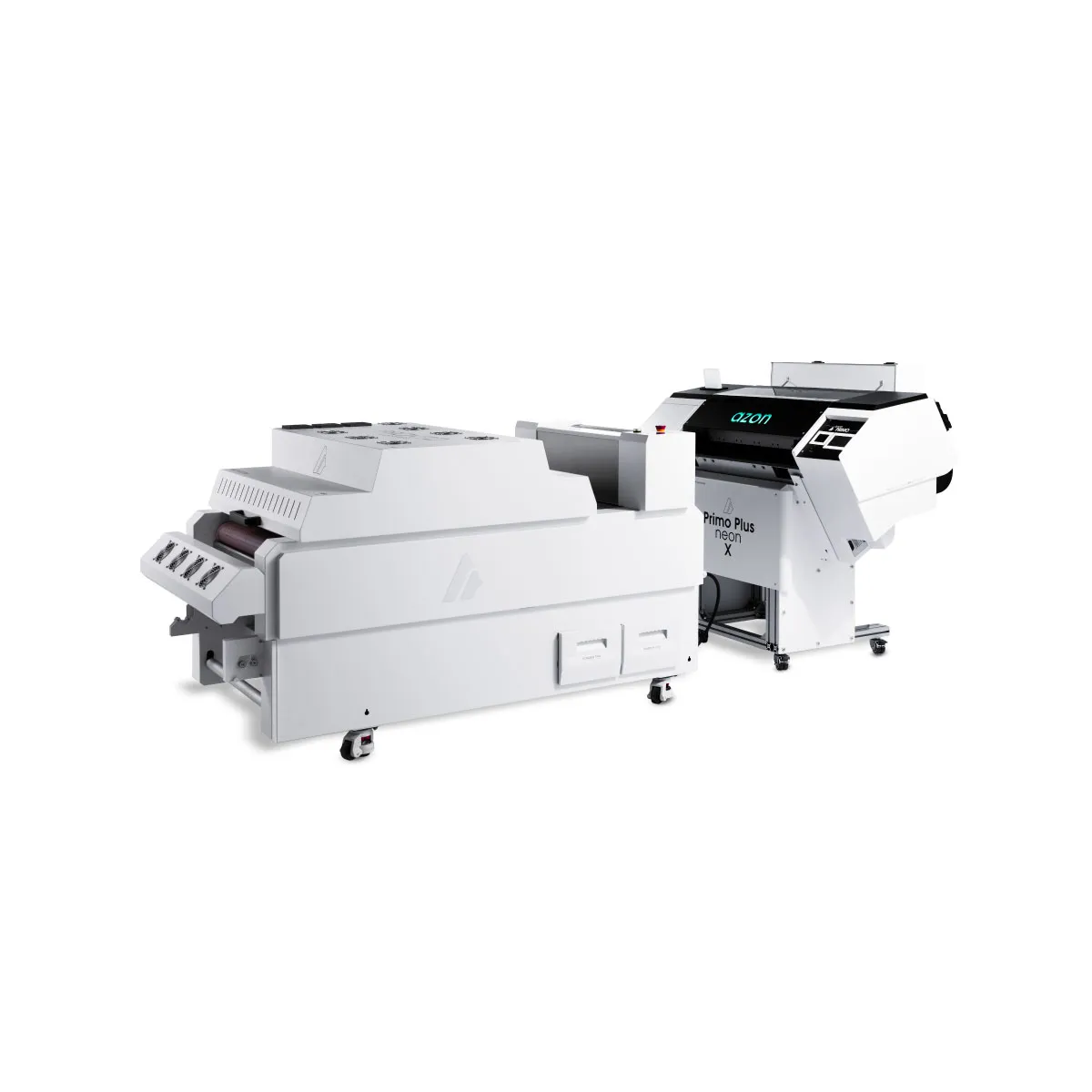 Azon Primo Plus yra „„”Vairas-prie-Vairo” can be translated to “Roll-to-Roll” in English“ – „Švirkšto-prie-švirkšto“ tipo DTF spausdintuvas su automatišku lipnios medžiagos įtaisu Šis spausdinimo modelis leidžia vykdyti didelio tiražo gamybą Nebereikia rankiniu būdu užtepti Nano klijų arba įdėti filmus į orkaitę— sistema turi integruotą lipnios medžiagos platinimo įrenginį ir orkaitę, kurie viską tvarko automatiškai